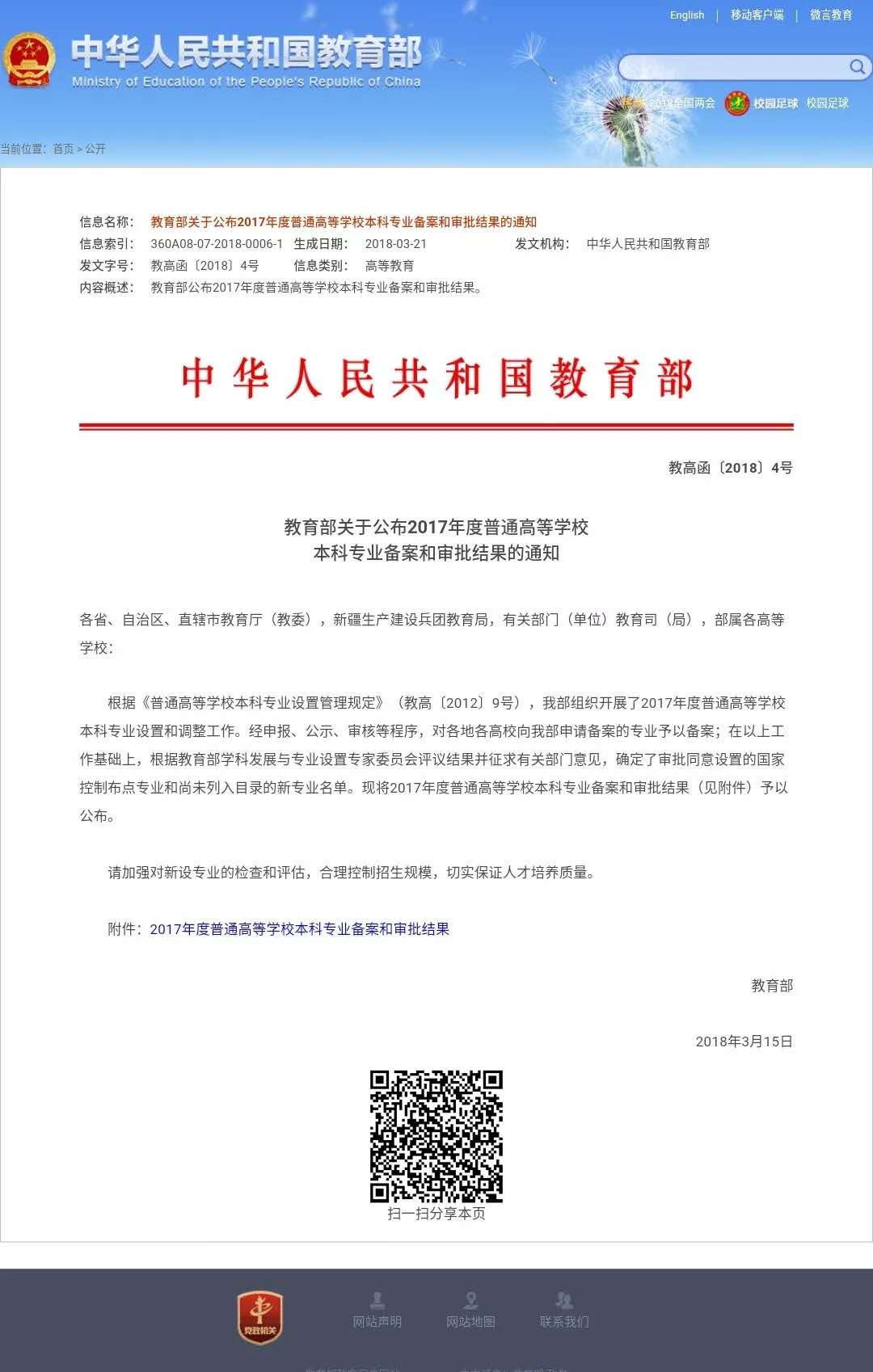 2018年3月21日,教育部发布《教育部关于公布2017年度普通高等学校本科专业备案和审批结果的通知》,必赢官网风景园林、商务英语两个专业获批。