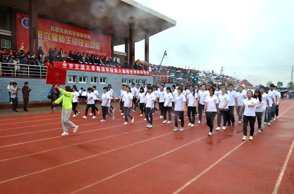 5月11日下午2:00,以“运动海滨·活力青春”为主题的北京交通大学海滨学院第六届田径运动会隆重开幕。政府领导:黄骅市政府副市长郑增强,市文广新局局长王文博;院领导:北京交通大学党委副书记、我院院长高福廷,执行院长王大勇,副院长张长铎、贾怀义、徐维祥、薛爱兴,副书记孙文博;投资方嘉宾:黄骅华城房地产开发有限公司总经理张如珠出席开幕式并在主席台就坐。开幕式由徐维祥副院长主持。