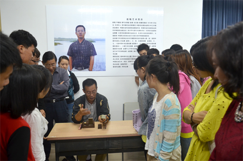 开幕式结束后,全体领导、来宾及师生代表走进艺术系展室观看展览。赵飚老师还现场讲解和展示了篆刻的创作过程,与我院师生亲切交流心得体会,并对我院学生的篆刻作品给予点评和指导。