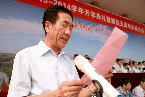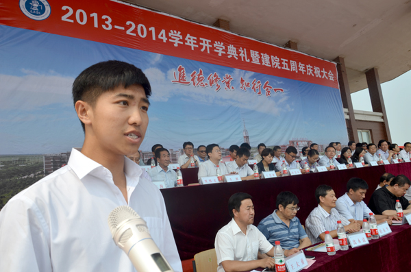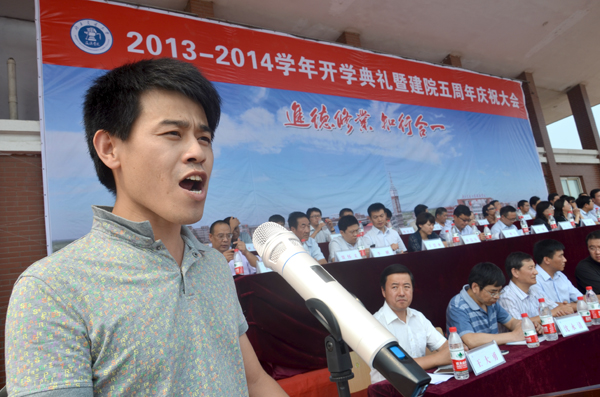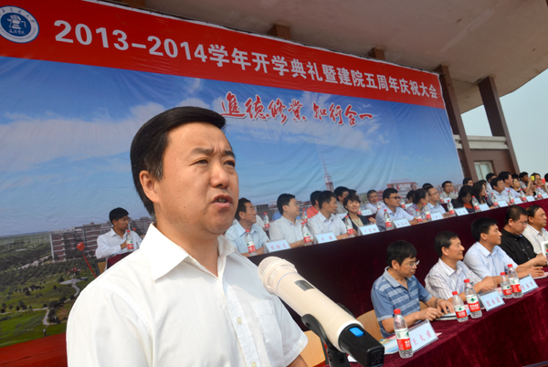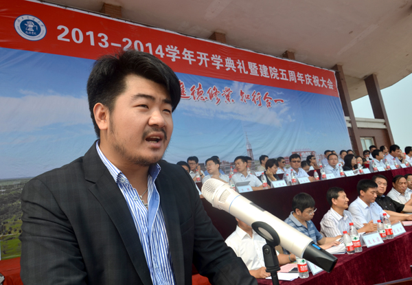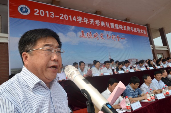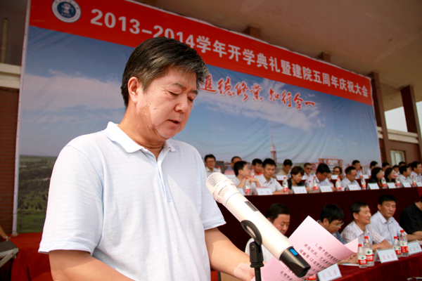 高福廷院长代表学院讲话。他首先代表学院领导班子和全体师生员工向出席大会的各位领导、各位来宾表示衷心的感谢,向刚刚成为海滨学子的2013级新同学表示热烈的祝贺,向为海滨学院建设与发展付出心血与汗水的全体海滨人致以崇高的敬意。接着,高院长从办学模式、发展历程、办学成绩等方面详细介绍了五年来我院的建设与发展的总体概况。他说,五年来,在黄骅市政府的大力支持下,海滨学院依托北京交通大学的优质教学资源和投资方的雄厚财力支持,通过大力实施“质量立校、人才强校、特色兴校”发展战略,从无到有、从小到大、由弱变强,重质量、求发展、创特色,在较短时间内就实现健康快速发展。今年学院又迎来了来自全国31个省市自治区的2800余名新同学,为学院的繁荣发展注入了新的活力。最后,高院长告诫2013级新同学一定要找准自己的定位、明确自己的目标、学好自己的专业、增强自己的本领,并分学会学习、增强自信、学会创造三大方面向同学们提出殷切希望。