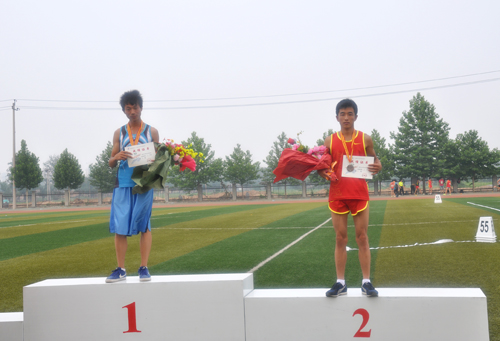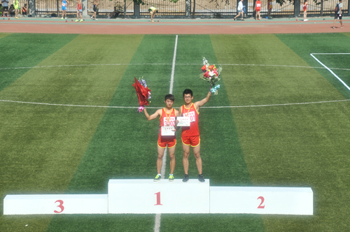 男子组100米第一名蒋盛吉、第二名李亚东在领奖台上