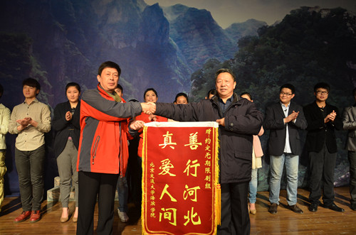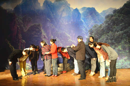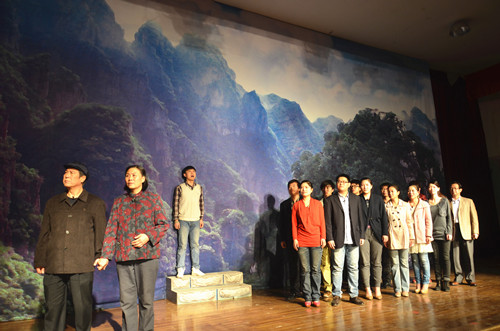 演出结束后,吴子成副院长代表学院为剧组赠送了锦旗。院领导上台与剧组全体人员亲切握手并合影留念。