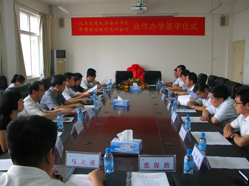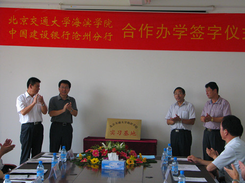 仪式由王大勇执行院长主持,王院长首先介绍了学院的总体情况及校企合作的基本思想。指出做好学院首届毕业生的就业工作是我院目前工作的重点之一,而校企合作的目的之一就是为黄骅及周边经济区发展培养专业知识过硬、动手能力强的毕业生,推动该地区的经济发展。中国建设银行沧州分行韩文金行长对我院办学取得的成绩表示祝贺,他认为海滨学院的创办结束了沧州地区无本科院校的历史,为沧州地区的经济、文化发展带来新的活力,推动沧州地区的更加快速发展。