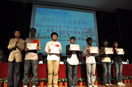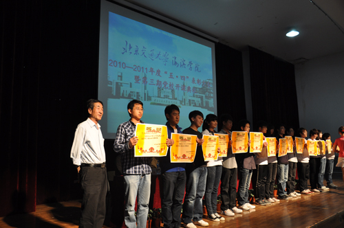 弘扬“五四”精神,激励青年学生不断挑战自我、奋发成才,我院团委于2011年5月6日下午在学院中心报告厅隆重举行了五四评优表彰大会暨第三期党校开课典礼,并取得圆满成功。学院执行院长王大勇,党委书记张平之,副书记、副院长张长铎,副院长贾怀义、吴子成、周俞波,学生处孙文博处长在主席台就座,大会由孙文博处长主持。