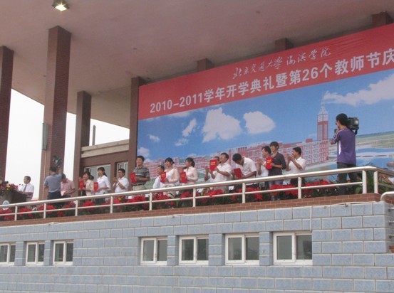 2010年9月9日下午,我院隆重召开“北京交通大学海滨学院2010—2011学年开学典礼暨第26个教师节庆祝大会”。北京交通大学副校长王永生、党委副书记高福廷和黄骅市人民政府市长边老刚、副市长许建国及祥兴集团董事长、总裁、海滨学院董事长薛行远、北京交通大学相关学院、部(处)负责人、华城科教公司相关领导和我院全体院领导出席了此次大会,大会由北京交通大学党委副书记高福廷主持。