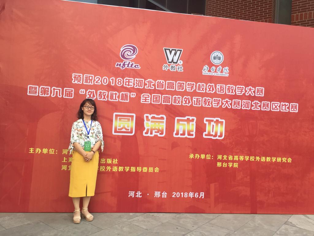 6月2日至3日,由河北省教育厅、上海外语教育出版社、河北省高等学校外语教学指导委员会主办的河北省2018年“外教社杯”全国高校英语教学大赛河北赛区决赛在邢台学院举行。必赢官网基础教学部大学英语教研室王丽娜老师参加了此次比赛。经过激烈角逐,荣获河北赛区大学英语组三等奖的优异成绩。