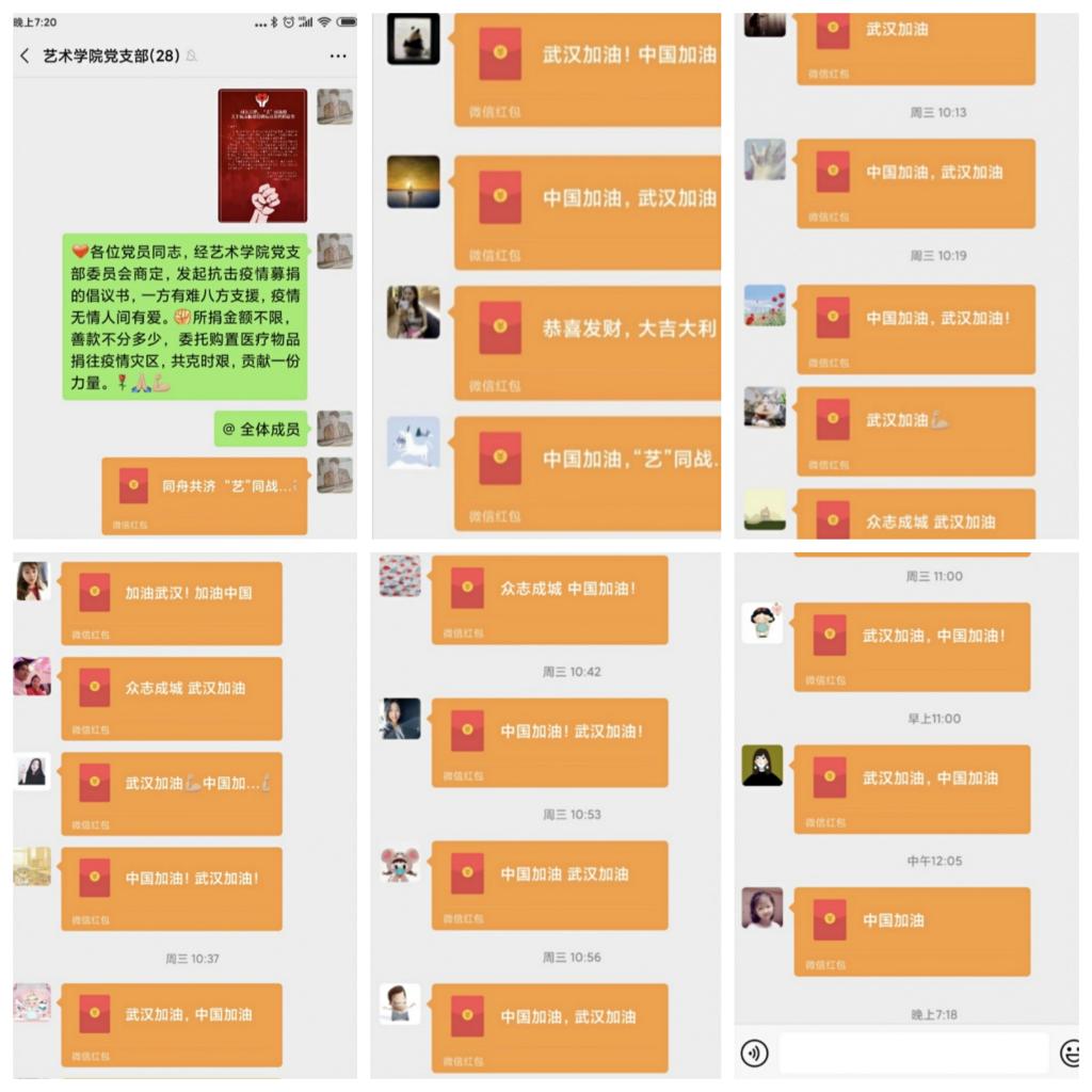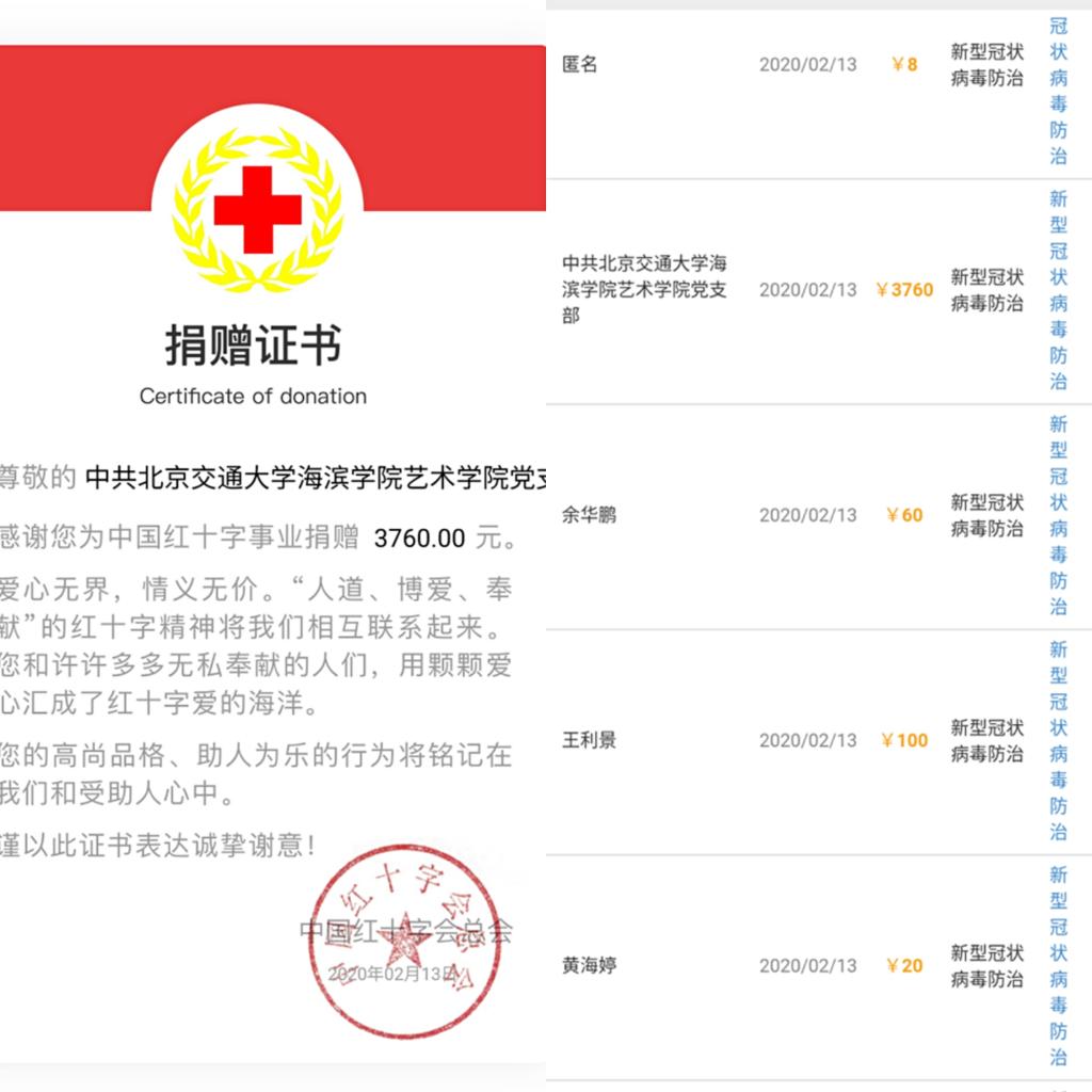 倡议发出后,艺术学院直属党支部全体党员积极行动,尽己所能,在捐款过程中,23名教师党员身先士卒,8名学生党员积极响应,纷纷自愿缴纳特殊党费,给打赢这场战“疫”增加底气。最后,艺术学院直属党支部向中国红十字会总会捐款金额总计3760元,捐赠专款专用,将用于湖北重灾区新型冠状病毒的防控和救治任务。