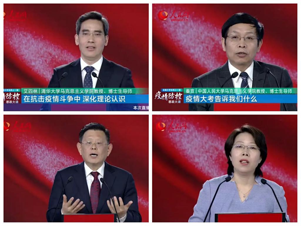 下午2:30开始,14000余名海滨学子齐聚“云端”,共同聆听这场“思政大课”。“思政大课”邀请了清华大学马克思主义学院艾四林、中国人民大学马克思主义学院秦宣、北京师范大学马克思主义学院王炳林、中央财经大学马克思主义学院冯秀军四位教授,深入解读党中央关于疫情防控的决策部署,分析中国抗疫彰显的中国共产党领导和中国特色社会主义制度的显著优势,讲述防疫抗疫一线的感人故事。