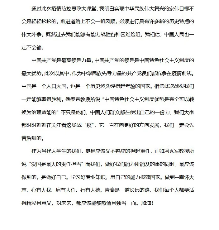 陈梦老师表示,抗击疫情,这是一场没有硝烟的战斗。“在以习近平为核心的党中央的坚强领导下,集中力量办大事,我们坚信,中国人民一定能够尽快取得抗疫斗争的最后胜利。作为一名普通的思政课教师,面对疫情,我一直在思考如何在这样一个特殊时期更好的将理论教学和疫情防控衔接,这次学习给了我很大的启发,我也一定会继续丰富教学内容,创新教学方法,增强线上教学效果,引导学生增强战胜疫情的决心和信心,认识到自身的使命和担当,帮助他们成长为有理想、有本领、有担当的时代新人。”