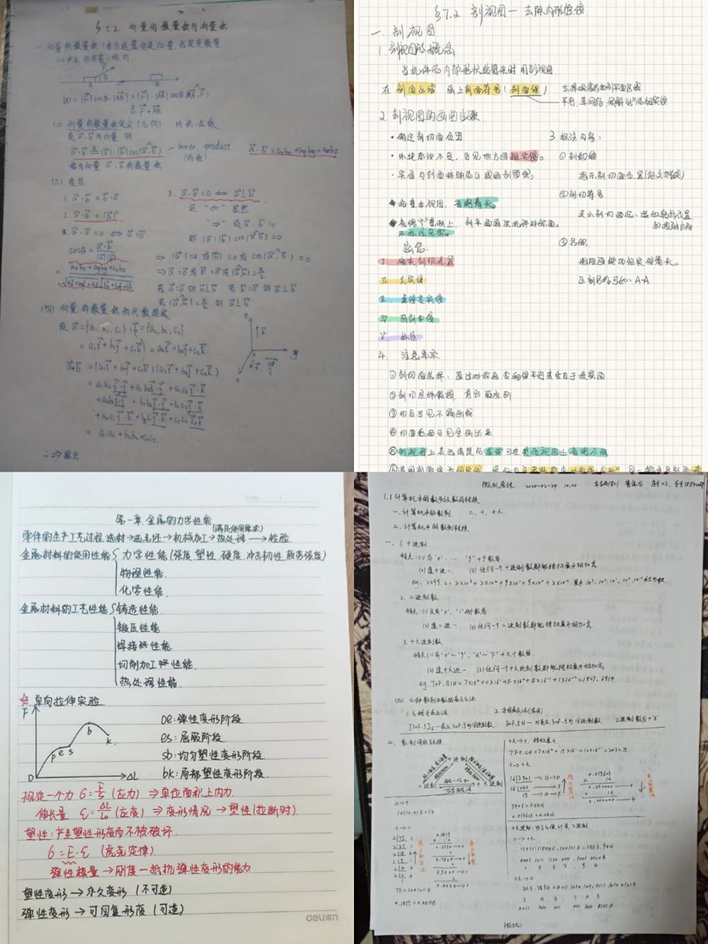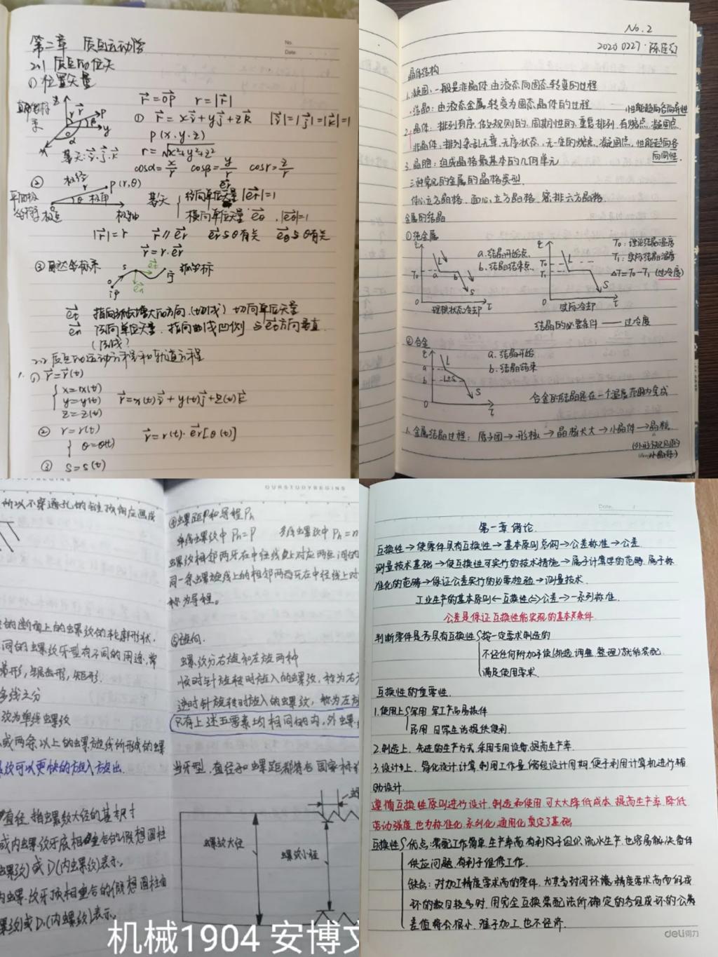 机械1703班张涛、机械1701班高爽、材料1901班田雨鑫、机械1904班安博文优秀笔记展示