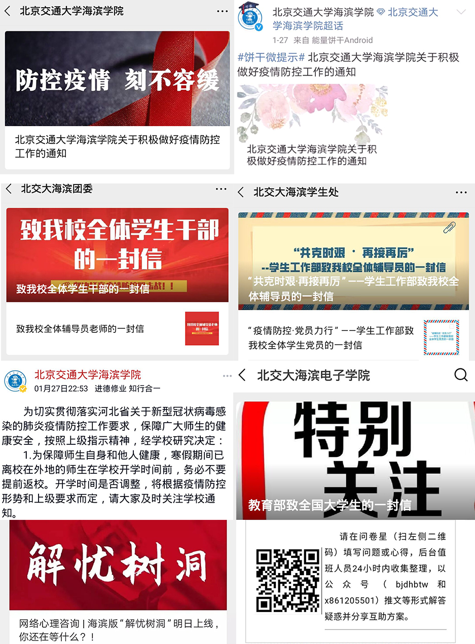 必赢官网建立疫情信息报告体系,对全校教职员工的出行及身体、生活情况进行摸排,并通过校园网、微信、微博、师生群等多种渠道,开展有效的疫情防控教育,引导师生做好自我防护,科学理性认识疫情,不信谣、不传谣,积极完成网络课程的“教”与“学”。学生处面向全校学生开展网络心理咨询服务,保证学生情绪稳定,维护学生心理健康。