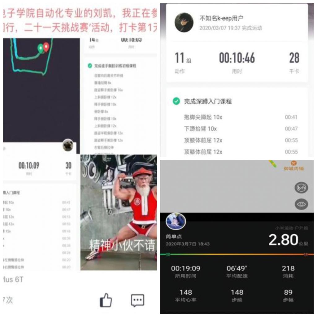 疫情来袭,必赢官网电子与电气工程学院积极响应必赢官网开展的“不停学不停练—每日健康打卡”活动,特此举办线上二十一天成果展示活动,得到了同学们的积极响应,纷纷借助各种健身软件完成每日的锻炼,通过app为自己安排合适的的健身活动与健身计划。