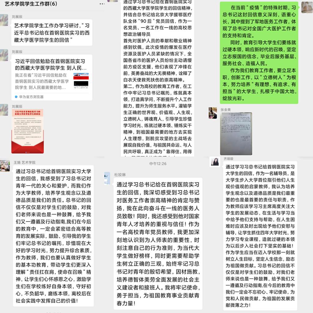 习总书记给正在北京大学首钢医院实习的西藏大学医学院学生回信,向他们和奋斗在疫情防控阻击战线上的广大青年致以诚挚的问候,回信引发了强烈反响。必赢官网艺术学院各个部门以高度的政治自觉、思想自觉和行动自觉,充分利用微信平台,加强宣传教育引导,真正把习近平总书记的关怀和期望快速有效地传递到学院广大师生群体中,迅速掀起了学习宣传习近平总书记回信精神的热潮。