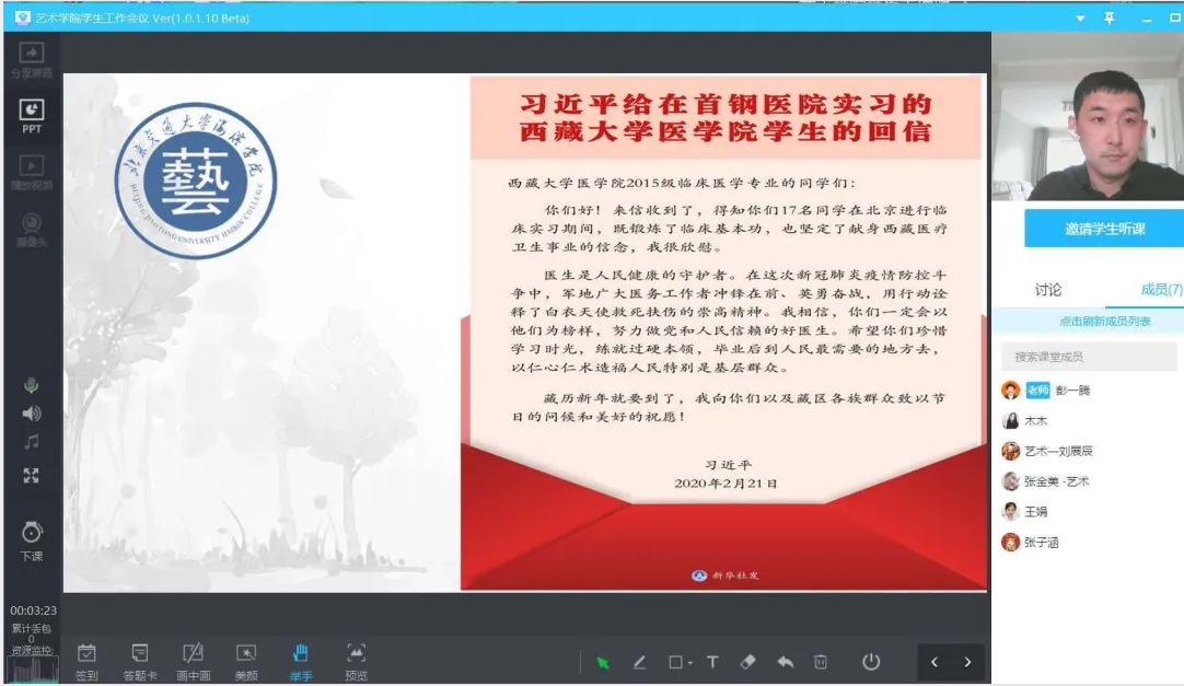 环艺1702班王金秋同学讲到,通过此次学习回信精神受益匪浅。习近平主席的来信中提到,在此次新冠肺炎疫情防控斗争中,军地广大医务工作者冲锋在前、英勇奋战,用行动诠释了白衣天使救死扶伤的崇高精神。希望同学们可以向冲锋在前的白衣天使作为榜样,也提醒同学们珍惜学习时光,练就本领,以仁心仁术造福人民群众。