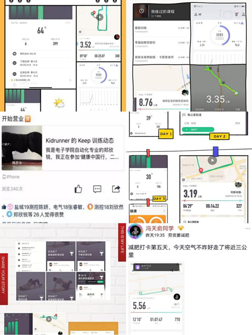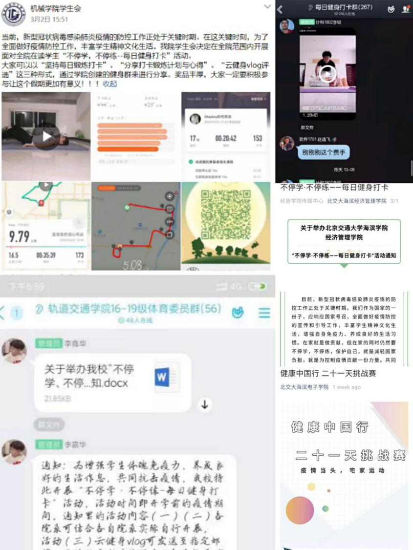 活动一经推出就受到了同学们的广泛欢迎和积极参与,居家运动锻炼的热情日渐高涨。本次打卡活动依托微信群、QQ群、公众号等新媒体平台,各院系学生自行下载运动应用软件,自由选择健身课程,通过每天发布健身视频或者运动记录完成打卡,工作人员定期核对同学们的打卡信息,简单的运动将远在全国各地同学们的心慢慢汇集在一起。