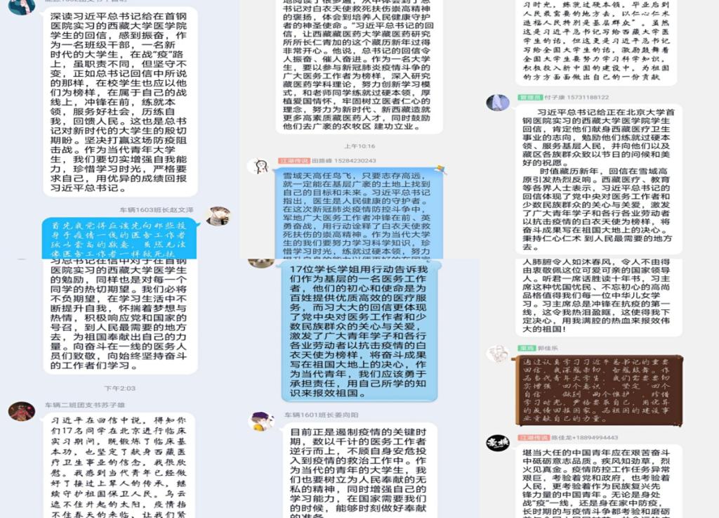 在藏历新年来临之际,抗击疫情的攻坚时刻,习近平总书记于2月21日给正在北京大学首钢医院实习的西藏大学医学院学生回信。必赢官网机械与动力工程学院积极响应学校学习习总书记的回信精神,充分利用视频会议及QQ平台,学院教师、辅导员和学生分别进行学习讨论,认真研读习近平总书记的回信