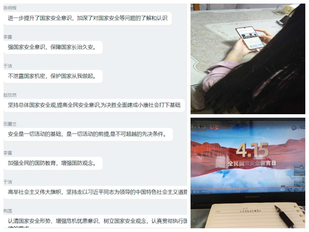 本次主题班会以收看全国公开课《千万学生同上一堂国家安全教育课——总体国家安全观视角下的疫情防控》为主要内容,外国语学院学生们热情高涨、认真学习,纷纷在笔记本上记录重要知识点,通过“云班会”、“群组讨论”等不同形式对国家安全相关话题进行了交流讨论。