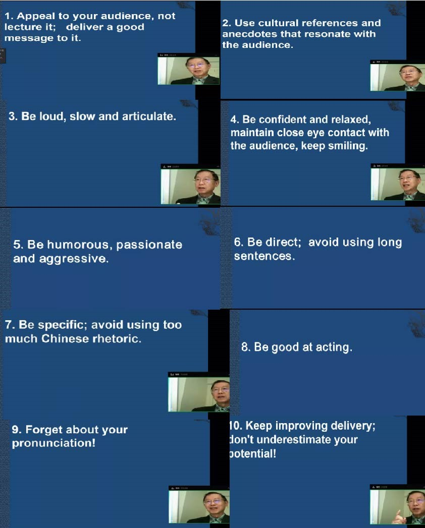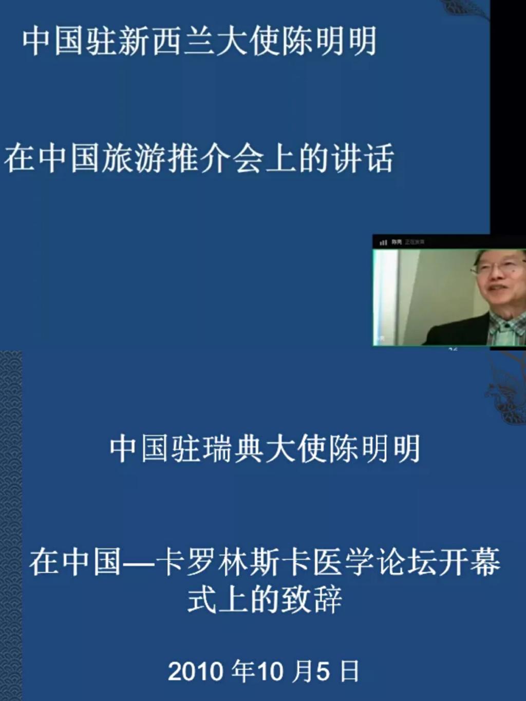 随后,陈明明大使向师生展示他在中国——卡罗林斯卡医学论坛开幕式上的致辞。他通过对如何提升演讲水平、如何更有效地展示演讲等方面的讲述,将知识细心讲解给师生,并在此基础上分享对演讲的理解,层层深入,让云端师生受益匪浅。同时,他希望师生能够掌握演讲稿的特点,学以致用。