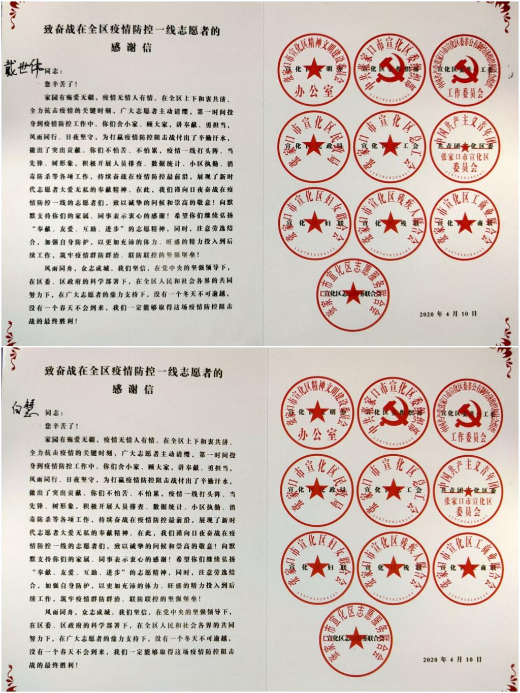 在志愿服务过程中,宣化区区委书记张聪对二人及其他优秀志愿者代表进行了亲切问候,赠送一次性口罩、手套等保障物资,并说道:“疫情是无情的,但我们古城宣化人民是有情的。青年就像八九点钟的太阳,永远是那群心中有光、路在脚下的奔跑者,你们的样子就是青年该有的样子。作为代表,要起积极的带头作用,落实好每天的工作,积极完成志愿服务,带领其他志愿者更好更快更高效的完成工作。”