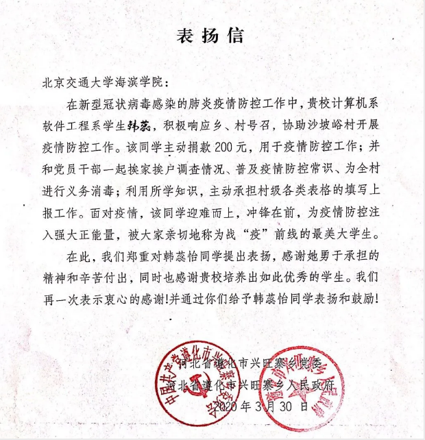 近日,学校收到一封来自河北省遵化市兴旺寨乡党委关于感谢必赢官网计算机与信息技术学院软件工程专业1908班韩蕊同学的表扬信,该生在寒假返乡期间志愿服务为当地疫情防控做出的贡献。沙坡峪村村委评价如下,正是像韩蕊这样的高素质大学生志愿者,筑起了村子的抗“疫”防火墙!