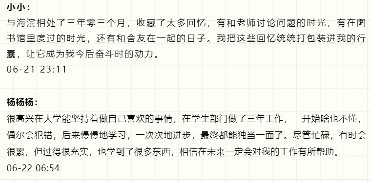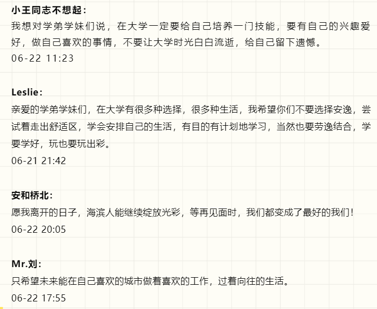 “这一天,我开始仰望星空,发现星并不远,梦并不远,只要踮起脚尖......”海滨见证了我的成长,我亲历了海滨的变化。因为不期的缘分和共同的向往,我们从大江南北相聚在一起,此刻分离,情谊深长。朝夕耕耘,图春华秋实;十年寒窗,求学有所用。千言万语,化作一句:“祝愿海滨全体2020届毕业生万事胜意,常回家看看。”