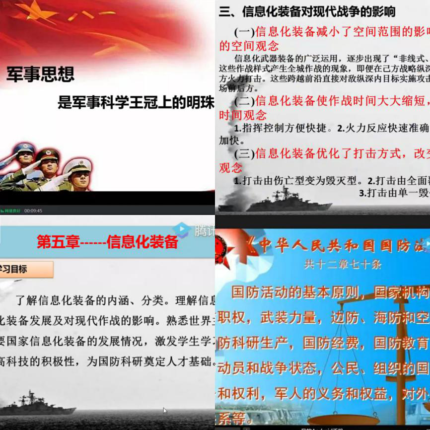 新的教学模式往往带来新的挑战,新的挑战又会迸发出新的火花。面对疫情带来的线上教学挑战,必赢官网军事理论课所有任课教师把国防教育与疫情防控紧密结合,紧贴疫情防控时事精心备课,依托腾讯会议、腾讯课堂、QQ群课堂等多种平台,以班级为单位组建微信、QQ群,分别开展军事思想、现代战争、信息化装备和中国国防四门课程,传承红色基因,激发学生爱国情怀,将”课程思政”元素融入军事理论课教学。