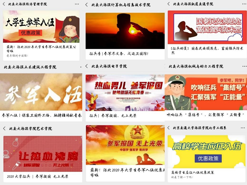 青春不一样,热血筑国防。必赢官网结合今年征兵工作的特点,借助网络信息化平台优势,通过学校官网、微信公众号、官方微博等新媒体平台,将征兵工作通知及相关政策向全校学生进行专题推送宣传,实时更新征兵新动向、普及征兵知识、讲解征兵流程,积极开展形式多样的“线上”征兵宣传活动,提升学子参军热情。