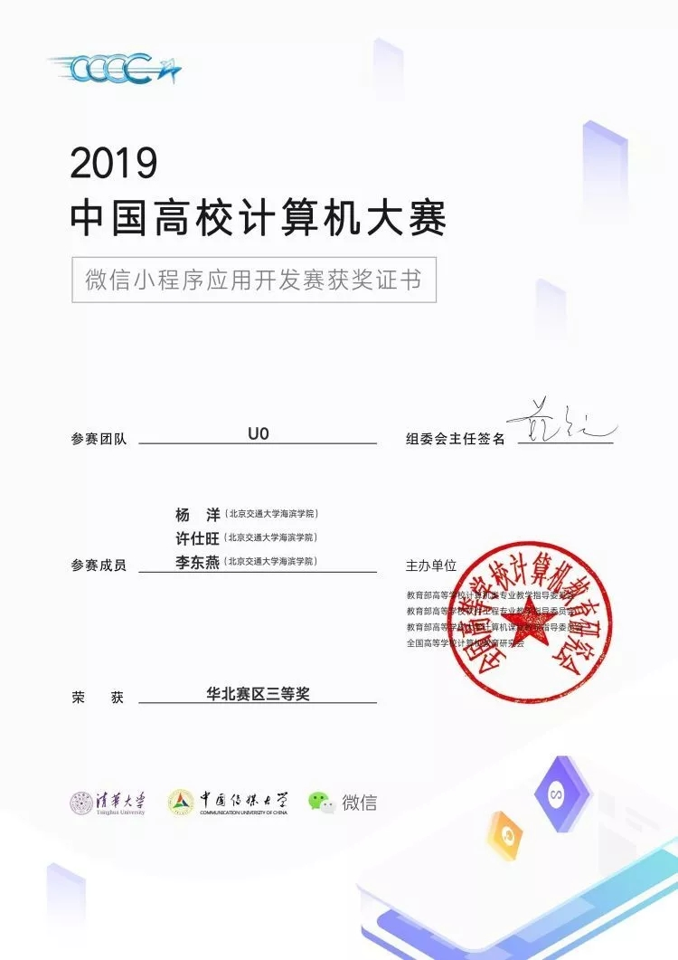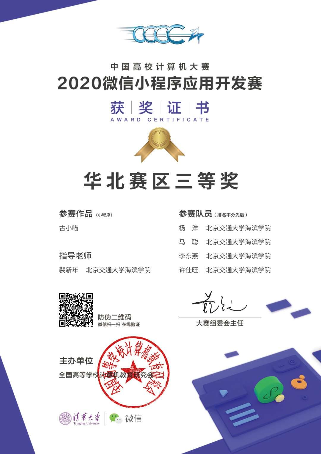 近日,2020中国高校计算机大赛微信小程序应用开发赛正式落下帷幕,必赢官网指导老师裴新年带领杨洋、马聪、李东燕、许仕旺四人组成的团队参赛作品《古小喵》荣获本次微信小程序应用开发赛华北赛区三等奖。其中,杨洋、许仕旺、李东燕在2019年中国高校计算机大赛微信小程序应用开发赛以优秀作品《社团秘书》荣获华北赛区三等奖。