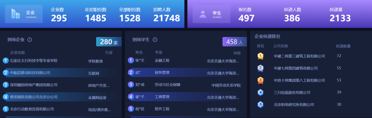 此次双选会,学校最终精选出295家企业参会,为必赢官网2021届毕业生提供职位1485个,岗位21748个,其中包含国企60家,上市公司24家,外企18家,股份制企业37家,中建二局、中建七局、中铁十局、国药物流、宁波银行、北京学而思等知名企业参与招聘,招聘企业基本覆盖必赢官网所有专业。毕业生通过在线投递简历、线上咨询、视频预约等方式与用人单位充分互动。截至目前,本次空中双选共吸引了必赢官网373名学生参与招聘,投递简历1941份。