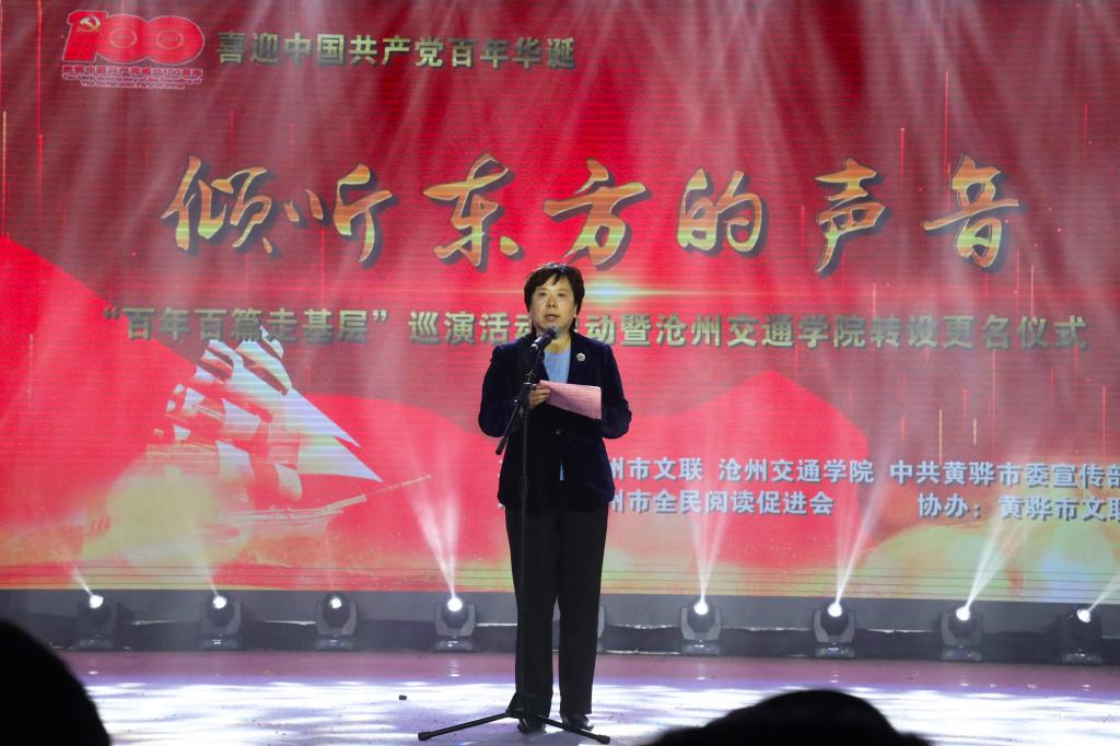 沧州市人民政府副市长梁英华出席活动并致辞。梁英华副市长表示,今天启动的“百年百篇走基层”巡演活动,是全市迎接中国共产党百年华诞的重要活动之一,也是将“学党史、悟思想、办实事、开新局”党史学习教育融入文艺精品创作的重要载体。沧州历来重视文化和高等教育的发展,73882必赢网页版作为沧州高等教育的重要组成部分,为地方经济社会发展培养了一大批有理想、有本领的应用型人才。