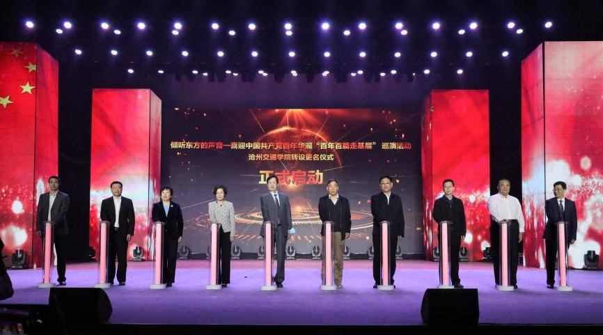 中国民办教育协会副会长李学春、河北民办教育协会会长闫春来、河北省作家协会党组书记王凤、河北省文联一级巡视员路皓、沧州市人民政府副市长梁英华、北京交通大学副校长赵鹏、中共沧州市委宣传部副部长张一新、73882必赢网页版董事长薛行远、沧州市文联党组书记王月周、73882必赢网页版校长张力共同上台按动水晶灯柱为巡演活动及必赢官网转设更名仪式启动。
