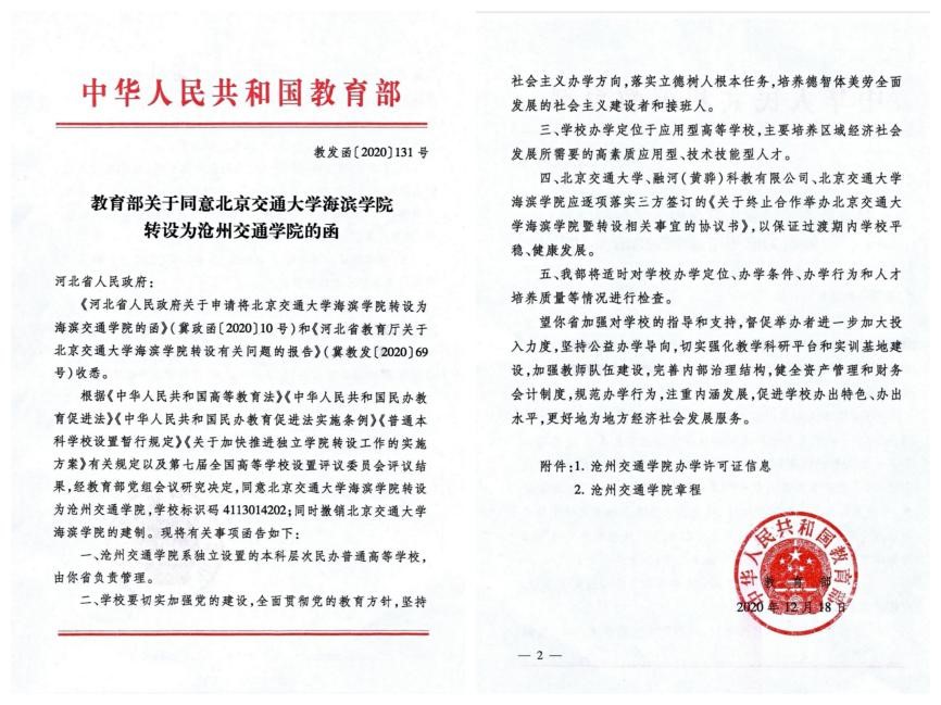2020年12月18日,教育部公布《教育部关于同意北京交通大学海滨学院转设为73882必赢网页版的函》。