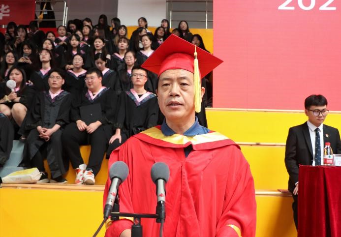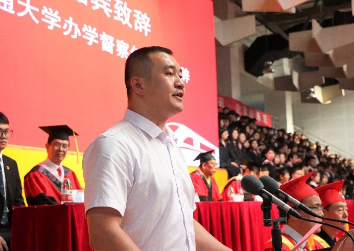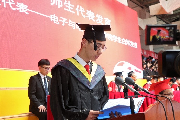 毕业生代表白洋在发言中表示在母校的这四年获取了成长,实现了一次人生的跨越。作为一名准毕业生,他祝愿各位毕业生思源致远,前程似锦,祝愿母校蓬勃发展,桃李芬芳。