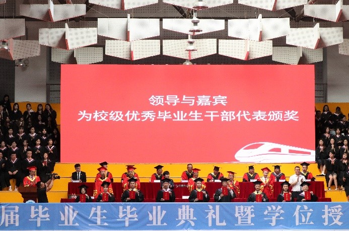主席台前排领导与嘉宾为校级优秀毕业生干部代表颁奖。