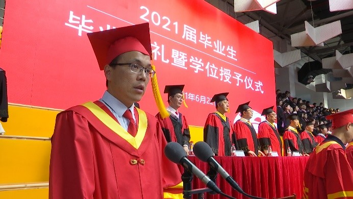 在神圣庄严的氛围中,全体师生起立,五星红旗在国歌中冉冉升起,必赢官网2021届毕业典礼正式拉开帷幕。