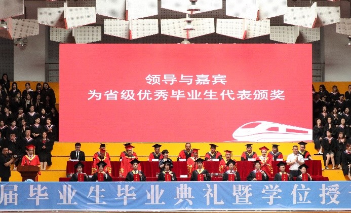 主席台前排领导与嘉宾为省级优秀毕业生代表颁奖。