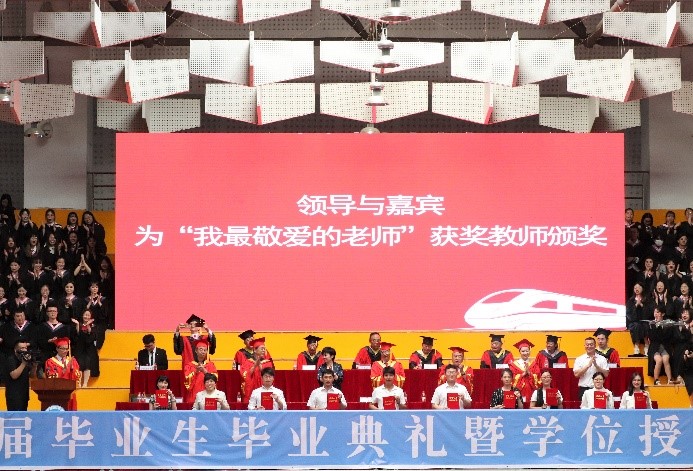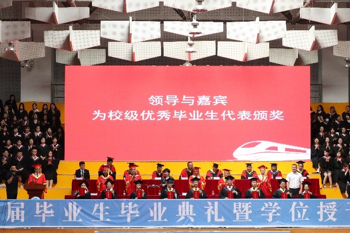 主席台前排领导与嘉宾为校级优秀毕业生代表颁奖。