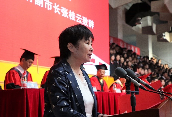 黄骅市人民政府副市长张桂云代表黄骅市委、黄骅市人民政府致辞,张桂云副市长讲到,2021届毕业生在校求学期间,见证了党的十九大胜利召开、纪念“五四”运动100周年和庆祝新中国成立70周年等重大历史节点,且毕业之时恰逢中国共产党成立100周年,她希望毕业生们作为实现第二个百年奋斗目标的建设者、见证者,能够带着对大学生活,对黄骅的美好记忆,追风破浪,策马扬鞭,共同绘就新时代的篇章。