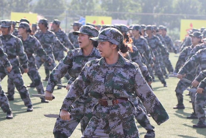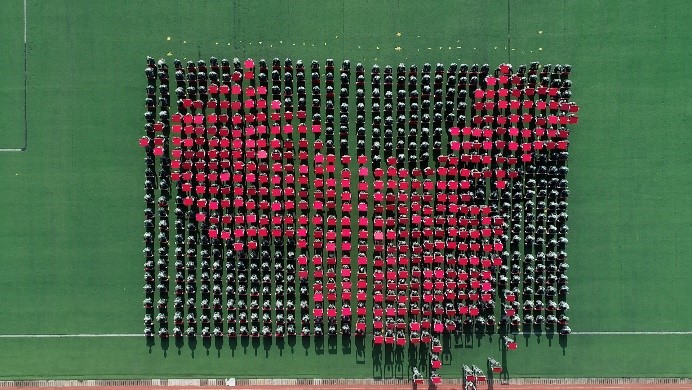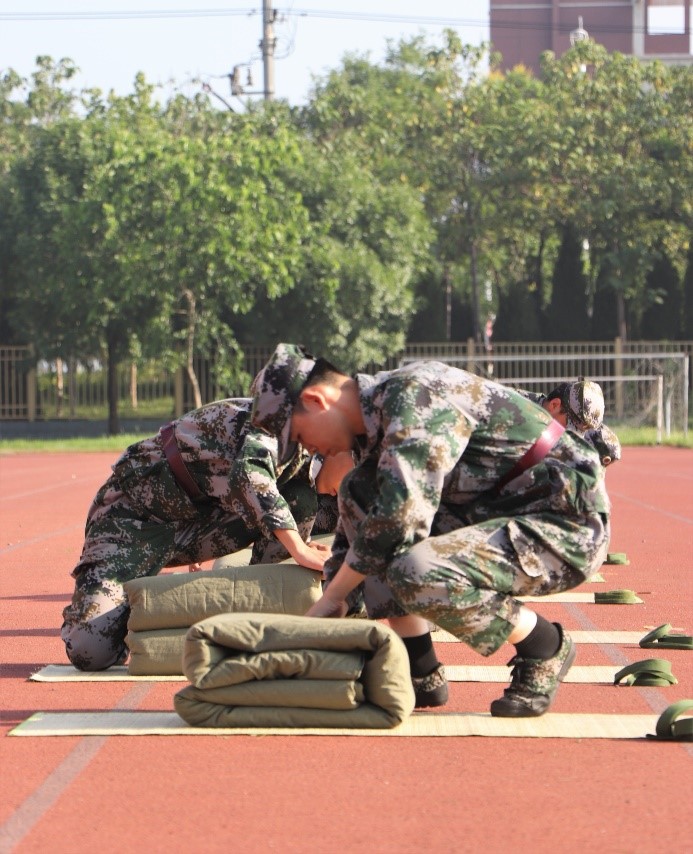 在《分列式进行曲》铿锵的节奏中,各个方阵依次迈着整齐的步伐走过主席台接受检阅,他们昂扬自信、雄姿英发、步履铿锵、神采飞扬,坚定的摆臂、整齐的步伐、嘹亮的口号彰显了2020级学子热情饱满的精神面貌。“出门看队伍,进门看内务”,寝室内务整理是军训的重要内容之一。内务表演方阵的学员们“铺平”、“压实”、“翻折”、“捏角”,得心应手,游刃有余。在拼字方阵表演中,学员们不断变换阵型,摆出“中国”、“党徽”、“钟楼”等巨幅图案。以“青春之歌”唱响祖国,直抒爱党爱国情怀。女生匕首操表演气势恢宏、刚劲有力,透露出巾帼不让须眉的英雄气概,赢得看台观众阵阵掌声。男生们的军体拳表演犹如蛟龙出海、猛虎下山,展示出2020级学员的飒爽英姿。行云流水的动作让观众震撼称奇,一度将现场气氛推至高潮。