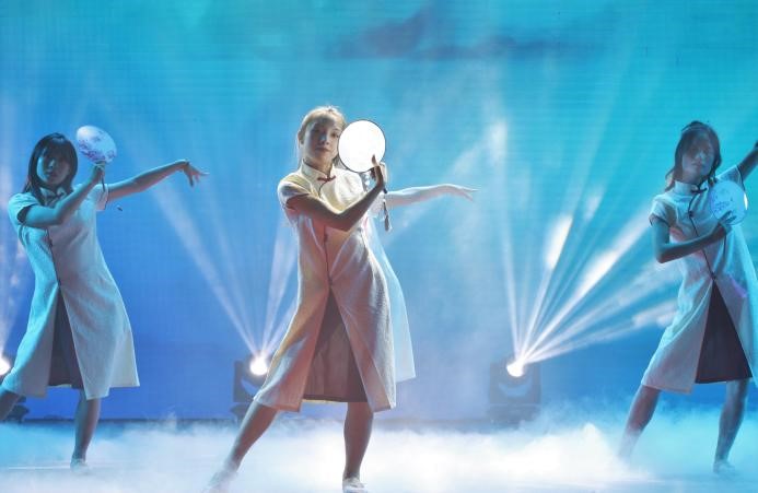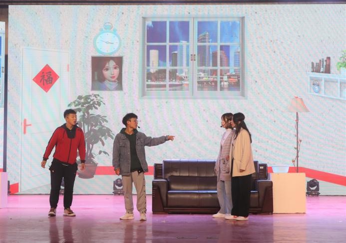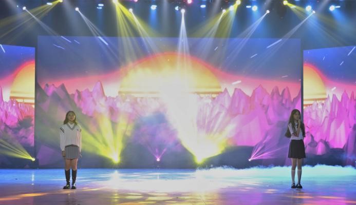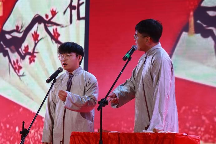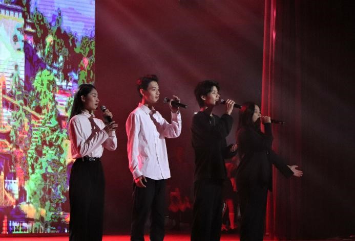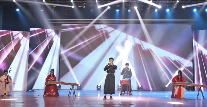 绽·中华“新”风采。第二篇章向我们展示了走过百年峥嵘岁月、与祖国并行的热情与初心。器乐合奏《权御天下》气势如虹,让那段可歌可泣的恢宏历史宛如就在眼前;相声《自食其果》以幽默诙谐的方式告诉学生要谨言慎行;舞蹈《芒种》结合中华传统节气舞动传统文化的风采;歌曲《时空》让我们穿越时光隧道与古人相逢。