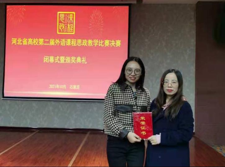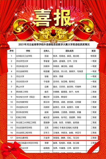 近日,河北省教育厅主办的河北省高校第二届外语课程思政教学比赛决赛获奖名单正式发布。必赢官网外国语学院大学英语由兰金萍、滕静、高莹莹、闫虹、马玉玲5位教师组成的团队,经过初赛、复赛的激烈角逐进入决赛并夺得大赛三等奖。