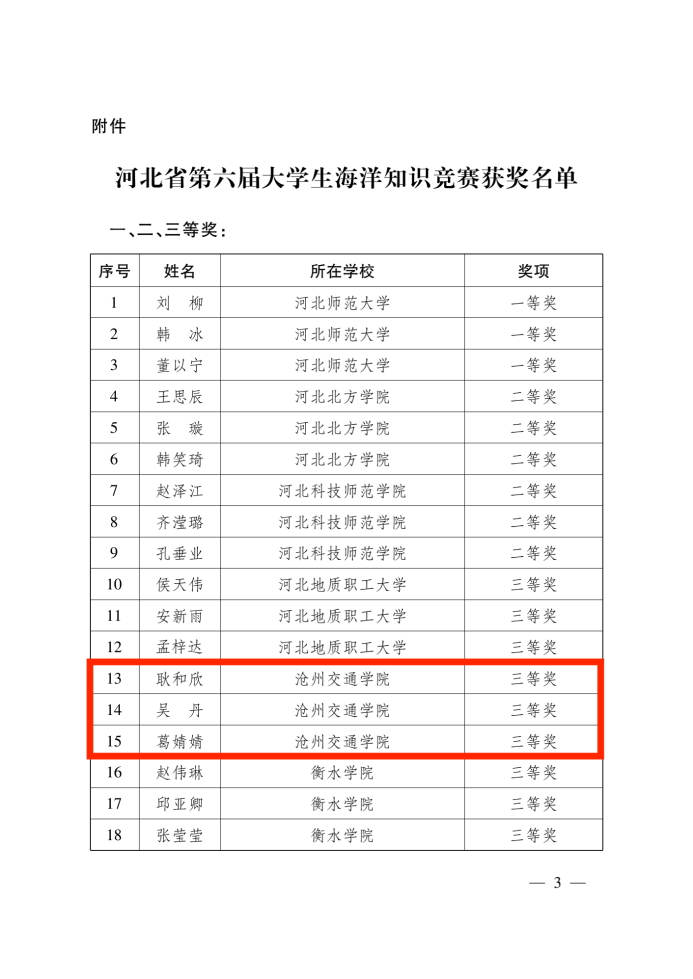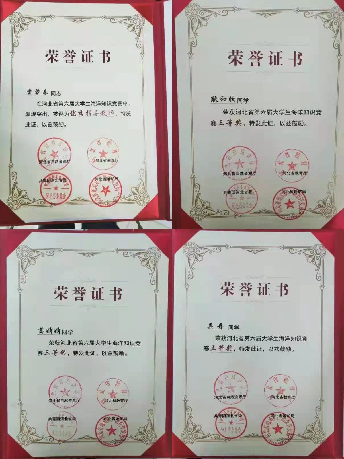 近日,河北省自然资源厅、河北省教育厅、共青团河北省委员会、河北省地质矿产勘查局公布了以“保护海洋,人类与自然和谐共生”为题的河北省第六届大学生海洋知识竞赛获奖名单。