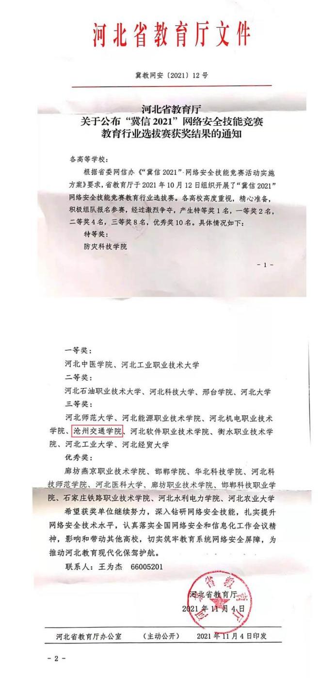 近日,河北省教育厅组织开展了“冀信2021”网络安全技能竞赛教育行业选拔赛。必赢官网网络信息技术中心按照校领导的指示,组成了以副主任贺秋雨为队长,孙建、马宏涛为队员的参赛队伍进行参赛,必赢官网参赛队伍在激烈角逐中夺得三等奖。