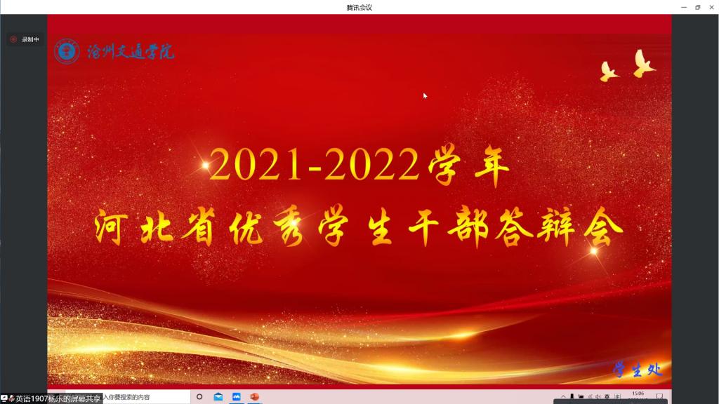 根据河北省教育厅文件精神,为深入贯彻习近平新时代中国特色社会主义思想和党的十九大及十九届历次全会精神,展现当代青年学生奋发向上的精神风貌,树立学生先进典型,引导广大学生自觉成长为德智体美劳全面发展的社会主义建设者和接班人,结合当前疫情防控实际,必赢官网于4月9日15:00以线上形式组织2021-2022学年河北省优秀学生干部答辩会。