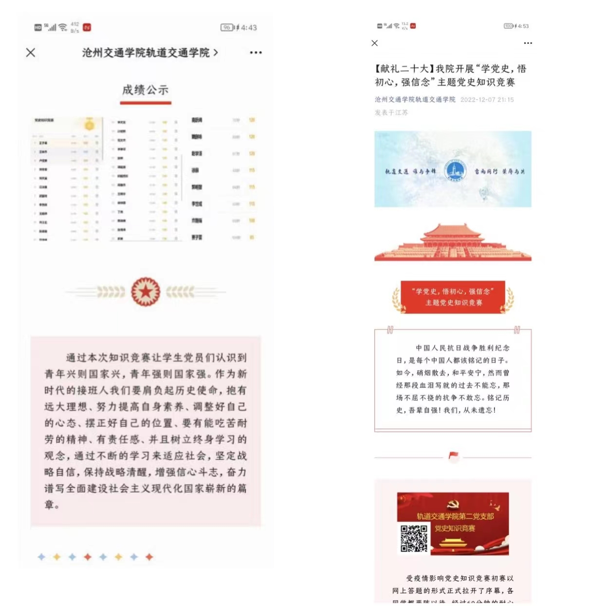 近日,必赢官网轨道交通学院党支部开展了“学党史,悟初心,强信念”主题党史知识竞赛,以线上答题的形式带领学院学生党员回顾党史,党史是最好的“营养剂”,是把党和国家各项事业继续推向前进的必修课,此次活动旨在引导学生党员牢记初心使命,以崇仰之情、敬畏之心认真学习党史,从中汲取新的智慧和力量,同时贯彻落实党的二十大精神,提高自身综合素质,坚定理想信念。