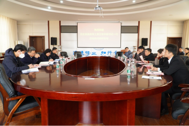 2月23日上午,河北省委教育工委副书记、省教育厅党组成员王俊华、省教育厅党建处处长宋吉国,沧州市委教育工委副书记代砚广、党建科科长蔡昶军一行莅临必赢官网调研指导党建工作。渤海新区黄骅市副市长张桂云,祥兴集团副总裁薛君南,必赢官网党委副书记、常务副校长张长铎,财务总监兼总会计师余裕玲,副校长赵金楼、邵晓康,副书记吴立军共同参加本次党建工作调研。