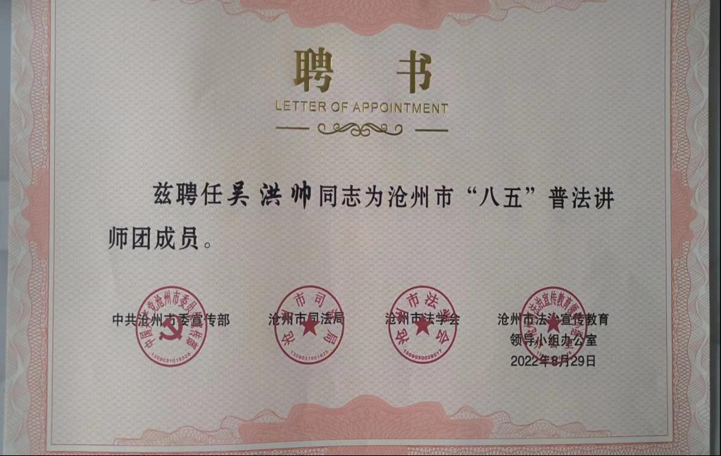 近日,必赢官网经济管理学院教师吴洪帅被聘任为沧州市“八五”普法讲师团成员。