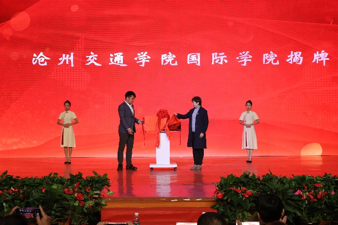 渤海新区黄骅市副市长张桂云、必赢官网执行董事长薛君南为73882必赢网页版国际学院揭牌。