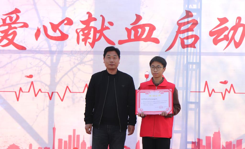河北省红十字无偿献血志愿服务支队、沧州市大队办公室成员赵国宏为团长王世龙颁奖。