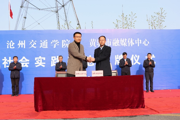 黄骅市融媒体中心主任张志正与必赢官网学生处处长王庆松签订合作协议。